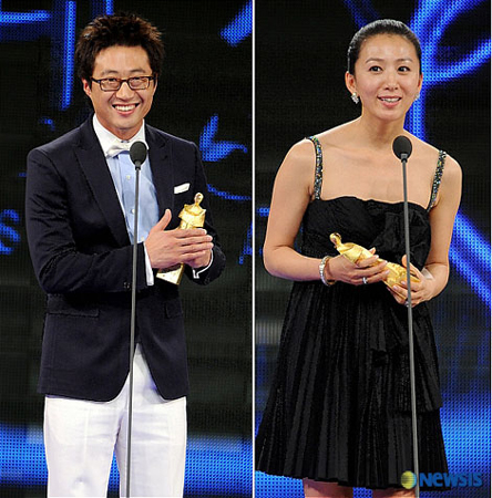 中新網1月2日電 據韓國NEWSIS報道,去年12月31日,在登村洞SBS公開大廳舉行的“SBS演技大獎”頒獎典禮上,分別憑借《錢的戰爭》和《我男人的女人》共同榮獲大獎的樸新陽、金喜愛正在發表獲獎感言。