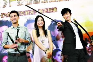 被稱為“偶像版武俠劇“的2008版《射雕英雄傳》(《射雕》)于9日起每晚7時(shí)在廣州電視臺綜合頻道播出。昨日,《射雕》的主演胡歌、林依晨、袁弘親蒞廣州,現(xiàn)場大批女粉絲早早就前來支持偶像,并紛紛上臺為3位主演送禮物,結(jié)果胡歌收到的禮物還沒有袁弘多,很多人都認(rèn)為楊康演得非常好。 (記者 陳羽中 實(shí)習(xí)生 王高財(cái)/文 倪黎祥/圖)
