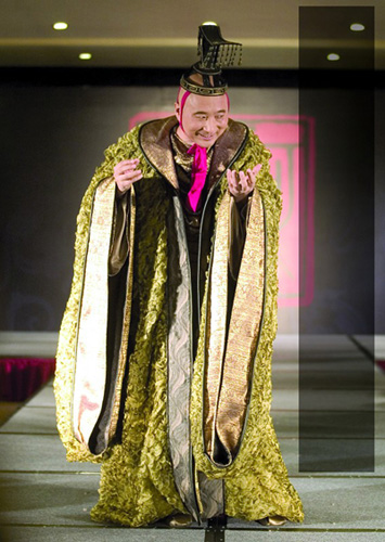 陳佩斯身穿金黃色龍袍在T臺上大作秀,“阿斗”的服裝是雙面設計,被陳佩斯稱為節約的龍袍。