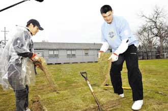 日前,功夫巨星李連杰與中國球員姚明一起出席了美國NBA全明星慈善活動,參加了新奧爾良巨星城的慈善植草皮活動。這個城市在去年遭受到了“卡特琳娜”颶風的襲擊,因此這次的全明星球員們不僅僅只是會去比賽,還會幫助當地居民們做一些慈善的事情。其中中國球員姚明和著名的功夫巨星李連杰也在這些慈善事情中做出了自己的貢獻。圖為李連杰與姚明一起合作植草皮。