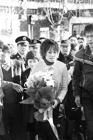 9時30分,一輛黑色加長林肯開到樓前,看熱鬧的市民已達幾百人之多,呼啦一下從三面圍過來!皠詰c!劉曉慶!”有舉著手機拍照的市民為博得劉曉慶一個回頭,扯著嗓子大喊。