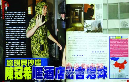 周刊還爆出,一直有吸煙習慣的陳冠希住在酒店吸煙層9樓,而且他已經與酒店達成協議,一旦有需要,可利用酒店的特殊通道出入。