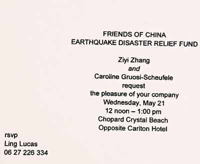 章子怡昨在戛納Tod's派對上廣發賑災活動邀請卡(下圖)。