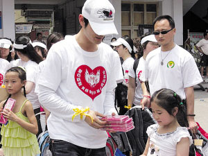 5月16日,在“5·12地震”發生的第四天,黃曉明帶著醫療和救援志愿隊趕到受災最嚴重的遵道鎮、漢旺鎮和死傷人數最為慘重的東方汽輪廠等地,以一名普通志愿者的身份默默幫忙。昨天,在兒童節這一天,黃曉明又親自率領自己的愛心基金會成員們,二度進入重災區綿陽安縣的數所小學,給孩子們帶去急缺的生活學習用品。本報記者昨天也全程陪同,見證了這位將慈善視之“習慣”的明星的真性情一面。