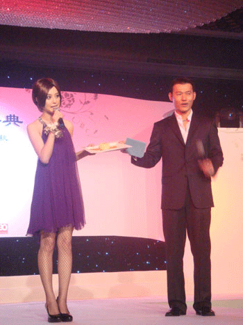 當晚,女星范冰冰著一身紫色露背晚裝壓軸登場。范冰冰稱自己此次設計的冰淇淋月餅是特意為奧運健兒劉翔所做。她說,劉翔的名字里有個“翔”,所以在這個冰淇淋月餅原有的基礎上加了一對翅膀,希望這個跑得最快的天使,在今年北京奧運會上能再次奪冠,也祝福所有正在為奧運正在忙碌的人們。
