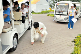 日前,悄悄飛來北京的成龍大哥,在十多位工作人員的陪同下,走進了嶄新的奧林匹克主題公園。身為北京奧運義務宣傳大使的他,這次自然又是為了即將開幕的奧運盛會,向世界宣傳一座新奧運城——北京。半路上,坐在觀光車上的成龍突然一個箭步跳下車來,大哥的這個動作也讓眾人嚇了一跳。而更讓人沒有想到的是,這位功夫之王現場展現了真功夫,騰空一躍,卻只是為了一個煙頭。成龍俯身撿起工人不小心遺落的煙頭,走到垃圾桶旁丟了進去,神情自然,絲毫沒有作秀成分。