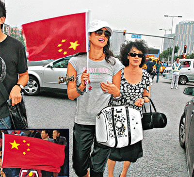 據香港媒體報道,昨日郭晶晶與吳敏霞成功奪金后,章子怡于下午約4時與母親離開水立方,心情興奮的她不停揮動中國國旗,但細看之下,她拿得竟是“倒裝”的國旗。想必是看到中國隊員再奪金,興高采烈地子怡并未留心此烏龍事件。