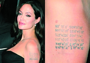 近日安吉麗娜·茱莉在新片《調包嬰兒》紐約首映禮時曝光了手臂上的新文身。記者仔細辨認才發現原來茱莉把她那雙胞胎孩子諾克斯與薇薇妮出生地的經緯度都刻在上面,目前,該手臂已收錄其6個子女的出生地經緯度。有媒體戲稱,茱莉的孩子來自五湖四海,弄得她自己都不記得了孩子從何而來,因此才把這些資料刻在手臂上,時刻提醒自己。