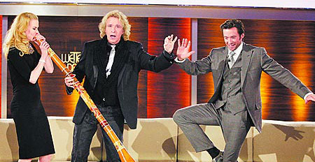 妮可(左)上節目吹奏澳洲土著樂器,銀幕搭檔休·杰克曼(右)金雞獨立。