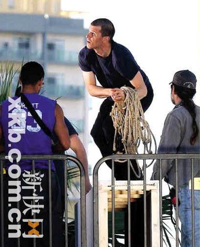 日前,溫特沃斯·米勒和他的特技替身在加州的瑪麗安德爾灣為劇集《越獄》拍攝一幕動作戲場景。特技替身和米帥一樣的發型、一樣的穿著,不湊近看,很難發現破綻。