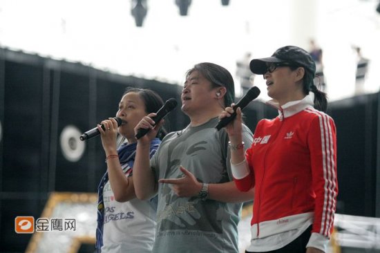 下午2點40分,三人同臺演唱了奧運歌曲《同一個世界 同一個夢想》,并與領舞成員進行了溝通交流。(馮紫劍)