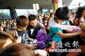 李宇春乘坐的航班計劃是在昨下午5時左右抵達,4時后江北機場的3號出口就已聚集了三四百名玉米,喊著他們自己的口號:“李宇春,重慶的”。每位玉米手上戴有一根黃絲帶,很有秩序地分成兩隊留出了約兩米寬的通道,隊伍最前面有十多名玉米,只待李宇春一出現,就組成人墻將其包圍,以防止李宇春被熱情粉絲抓到。