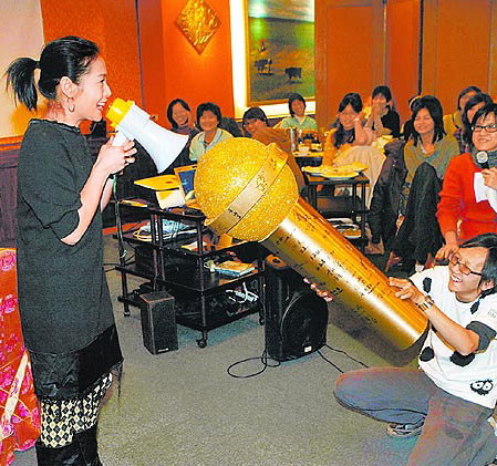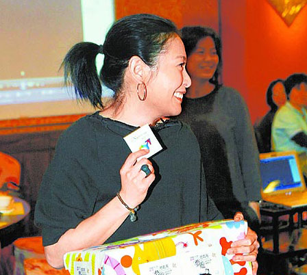 歌迷送劉若英(左)巨型麥克風,希望她繼續唱歌。
