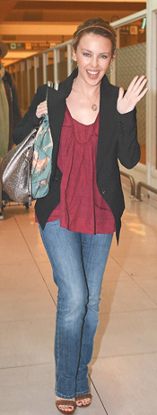 凱莉身穿黑色西裝、紫紅色上衣、牛仔褲,輕便俏麗,襯著歌迷“Can't Get You Out of My Head”的歌聲,她在自己請(qǐng)的一名女性保鏢、主辦單位請(qǐng)的10名保全護(hù)衛(wèi)下離開機(jī)場(chǎng),面對(duì)大批攝影記者幾乎貼近她臉的鏡頭,未顯任何不悅。