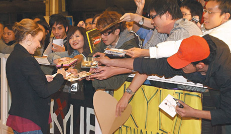 凱莉·米洛在機(jī)場(chǎng)為歌迷簽名。