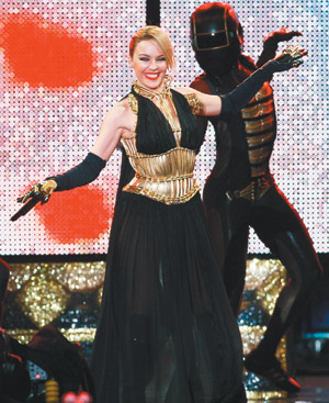 中新網(wǎng)12月5日電 澳洲天后凱莉·米洛(Kylie Minogue)首度赴臺開唱,以“女神”之姿降臨中山足球場舞臺,性感歌舞,征服了現(xiàn)場1萬6,000名觀眾。臺灣“聯(lián)合報”報道,當晚,凱莉一身金色束腰黑性感洋裝現(xiàn)身,釋放全場熱情,巨星魅力非凡。
