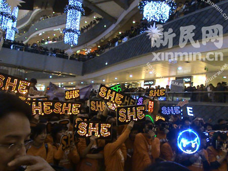 當日下午4時許,記者在簽售現場看到,近千粉絲身穿橙色歌迷會會服,高舉燈牌大喊S.H.E的名字,并稱金融風暴擋不住S.H.E專輯的大賣。