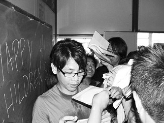 青羊區愛心學校的孩子們聽說陶喆要來教他們唱歌,興奮不已,早早便等候在草地上。陶喆一走進教室,孩子們便歡呼起來。陶喆先和孩子們合唱兒歌《兩只老虎》,引得教室內一片歡笑。精通各種樂器的陶喆還教學生們打節奏,學生們拍著課桌板,一起跟著他唱英文歌。隨著情緒不斷高漲,孩子們把課桌拍得震天響。“陶老師”頓時一臉嚴肅:“這樣會把桌子拍壞的。要輕輕地拍桌子,大聲地唱歌,明白了嗎?”于是,歌聲再次響起。