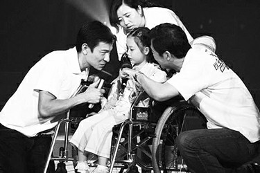 影視明星張國立講述的是《任思雨的故事》。北川有個(gè)叫任思雨的6歲女孩,她的雙腿被卡在廢墟中,當(dāng)救援隊(duì)員趕來時(shí),她咬緊牙關(guān)說:“叔叔,我不怕,你們不用擔(dān)心!”在救援過程中,這位受傷女孩忍著疼痛,輕輕地唱起了兒歌《兩只老虎》……歌壇“天王”劉德華上臺后,跪在這位坐在輪椅上的女孩前,對她說:“你是我們的驕傲!你讓我們感到敬佩!”接著,他率領(lǐng)眾多港臺明星唱起了歌曲《承諾》。