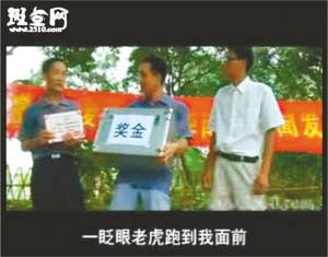 事隔4個(gè)多月后,近日“周老虎”還原真相成了紙老虎。隨后記者在斑點(diǎn)網(wǎng)等視頻網(wǎng)站上看到,從6月30日開(kāi)始,全長(zhǎng)27分47秒的視頻小電影《拍虎》也被傳到網(wǎng)上,片中周正龍被稱(chēng)為“周震聾”,因?yàn)榱謽I(yè)局張局長(zhǎng)承諾“如果當(dāng)?shù)卮迕裨谖覀兛疾礻?duì)進(jìn)山之前能發(fā)現(xiàn)華南虎,我們會(huì)給一箱錢(qián)作為獎(jiǎng)勵(lì)”,于是“周震聾”十分興奮,上山尋虎十幾天,最后與人密謀通過(guò)年畫(huà)拍出華南虎照片。全片最后表現(xiàn)“周震聾”在事情敗露后,從山崖摔下導(dǎo)致失憶,人也變得瘋瘋癲癲,成天抱著個(gè)假老虎模型唉聲嘆氣。