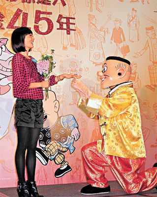 香港媒體報道,以往老夫子向陳小姐求婚均是失敗而回,昨日法拉飾演的陳小姐終于被老夫子誠意打動,接受求婚,并由《老夫子》創作人王澤先生見證。
