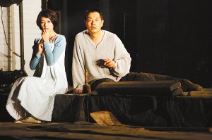 舞臺上,絕對主角濮存昕忽而瘋癲忽而安靜,還要不停地在舞臺上穿梭、奔跑、跳躍、吶喊,連觀眾都替他喊累。56歲的濮存昕還與30歲的高圓圓大談“忘年戀”,時(shí)而低頭密語,時(shí)而牽手狂奔,最為精彩的地方就是濮存昕將高圓圓攔腰熊抱而起。