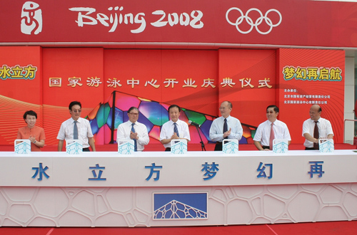 北京市副市長程紅在慶典中致辭。北京市委常委、統戰部部長牛有成宣布“國家游泳中心完成賽后改造,現重新對外開放”。隨后,中央及北京市有關領導、捐資人代表共同為水立方開啟“全新水立方 夢幻再啟航”的大門,水立方以嶄新的形象展現在社會公眾面前。參加慶典的領導隨后參觀了水立方場館,并出席了在水立方內舉辦的“港澳臺同胞海外華僑華人支持北京2008奧運會紀念展揭幕儀式”。