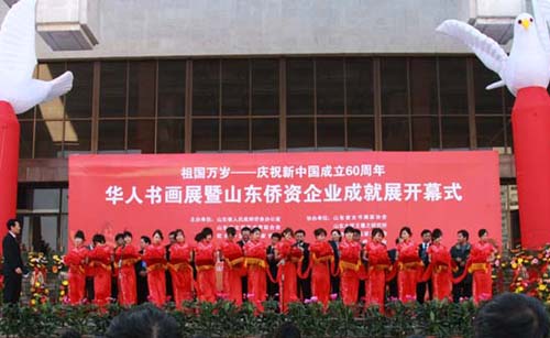 中新網11月10日電 據山東省僑辦消息,“祖國萬歲——慶祝新中國成立60周年華人書畫展暨山東僑資企業成就展”大型宣傳展覽活動11月6日在濟南拉開帷幕。國務院僑辦副主任馬儒沛、省政協副主席李德強、著名書畫家劉寶純出席活動開幕式并為活動剪彩。省僑辦主任王琳在開幕式上致辭,省僑辦黨組書記朱緒平主持開幕式。