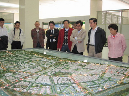 考察團一行首先到崇明規劃展示廳,觀看了崇明三島規劃模型示和情況介紹,并實地考察了西沙濕地公園和綠化鎮華西村。