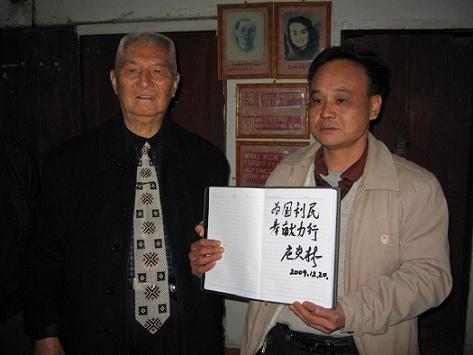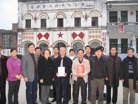 當(dāng)天下午,年近九旬的莊炎林,不顧旅途的疲勞,在梧州市僑聯(lián)主席鐘小欣、蒼梧縣統(tǒng)戰(zhàn)部部長(zhǎng)李燕芬等領(lǐng)導(dǎo)的陪同下,來(lái)到蒼梧縣石橋鎮(zhèn)中心小學(xué)考察。其中心小學(xué)是莊炎林先生在抗日戰(zhàn)爭(zhēng)期間,以教師身份掩護(hù)開展地下工作的地方。今日重游故地,莊炎林先生格外激動(dòng),并向陪同人員講起了當(dāng)年的工作情景。隨后莊炎林先生一邊聽取該學(xué)校的情況,一邊參觀當(dāng)年曾用過(guò)的工作室,并在留言簿上題詞:為國(guó)利民,奉獻(xiàn)力行。(蔡光天)