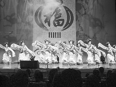 隨著《春節序曲》的播放,20個身穿紅色水褲的姑娘提著燈籠魚貫而入,載歌載舞。臨近結束,身著節日服裝,手拿鞭炮、雙魚的本地兒童擁上舞臺,又蹦又跳,把中國人在傳統節日里熱鬧歡騰、喜氣洋洋的場面表現得淋漓盡致。
