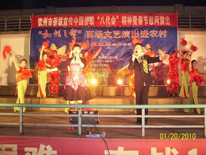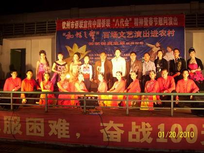 欽州市粵劇團共演出舞蹈、小品、獨唱等20多個節目,內容豐富多彩,謳歌了欽州改革開放成就,有鮮明地方特色。觀看群眾達到3000多人。