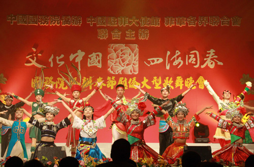 中新網(wǎng)2月21日電 2月19日晚,由中國(guó)國(guó)務(wù)院僑辦、中國(guó)駐菲律賓大使館和菲華各界聯(lián)合會(huì)聯(lián)合舉辦的“文化中國(guó)·四海同春”大型歌舞晚會(huì),在菲律賓首都馬尼拉的國(guó)際會(huì)展中心舉行。來自中國(guó)貴州、四川兩省的40余名藝術(shù)家為觀眾們獻(xiàn)上了一場(chǎng)匯集中國(guó)各地少數(shù)民族特色和地方民俗的精彩歌舞表演。圖為熱鬧喜慶的開場(chǎng)舞《花開中華大家園》。