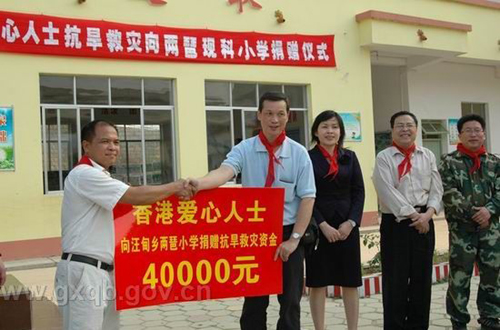 近段時間,廣西百色市右江區旺甸瑤族鄉兩琶村小學遭遇特大旱災,學校蓄水池斷水多日,引起了社會各界的廣泛關注,也牽動了廣西壯族自治區、百色市、右江區僑辦領導的心。經廣西僑辦搭橋牽線,香港謝家忠、葉林慧儀、原秋明等愛心人士,心系瑤寨小學生,千里奔瑤鄉,將一縷縷清澈的泉水運送到了旺甸瑤族鄉兩琶村小學。