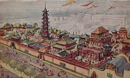 根據有關資料,“中國村”入口大門是一座巨大的牌坊,上面書寫著“華商展覽場”幾個大字!爸袊濉眱仍O有兩個酒家、兩座戲院、一座神廟和一座七層高的佛塔。“佛塔是中國村內最高建筑。”喬文安介紹,“中國村”內還建了一個陳列館和一二十家商店,分別展出中國的各類民間工藝品、瓷器、茶葉,還有少量具備科技含量的產品。