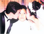 婚禮是在2000年1月16日美國洛杉磯一個(gè)安靜樸素的教堂舉行的。沒有華麗的布置,沒有熱鬧豪華的場(chǎng)面,但氣氛溫馨感人。我穿著婚紗,陶偉穿著禮服,張博宇穿的是白色的燕尾服,我們走進(jìn)了教堂。