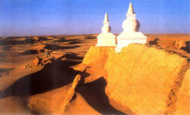 “勸君更盡一杯酒,西出陽關無故人”,絲綢之路經(jīng)過敦煌往西,出了陽關和玉門關后就是西域了!扒嫉押雾氃箺盍猴L不度玉門關”,向西跨越一步就是戈壁大漠。戈壁灘和沙漠是不同的,戈壁灘的表面是礫石,底下是土壤,這些戈壁只要加工處理,有水灌溉都可以變成人類生息繁衍的綠洲;而沙漠則是純粹的細沙。