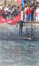 8月8日上午7時45分,在大連市旅順口老鐵山南岬角,張健和他的父親以及當地的漁民一起,按照當地的習俗,捧著滿滿一碗酒,走到海邊,把酒撒向大海。八點整,在4、5級海風的吹拂中,張健縱身躍入海中。
