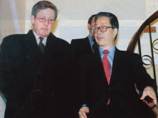 | 中國科學院院士、核物理學家楊福家就任諾丁漢大學的第五任校長。圖為楊福家教授(右)在倫敦和前來迎接他的諾丁漢大學副校長考林·坎貝爾交談。 |