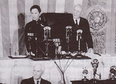 | 1943年2月18日,蔣夫人向美國眾議院發表演說,圖為眾院議長山姆·雷朋向眾議員介紹蔣夫人。 |
