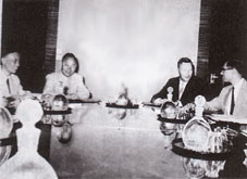 | 中美大使級會談期間,中方大使王炳南(左二)中方代表林平(左一)與美國大使尤·阿約翰遜在波蘭談判桌前。 |