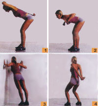 兩腿分開站立與臂同寬,手里拿一條卷緊的毛巾,兩手各握一端,沿著你的脊椎骨放好。一只手放在頭頂,另一只手放在臂部。膝蓋慢慢彎曲,身體微微向前傾斜,用力壓,同時保持背部伸直,停頓一會兒,然后再做一次,如此重覆10次。當然,這樣的練習也可以在你早晨彎下腰刷牙的時候進行,這樣就可以不用毛巾了。如圖(1)
