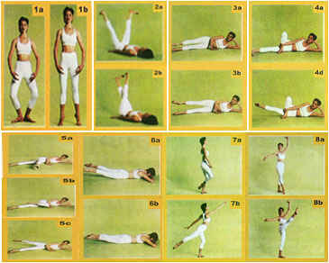 a. 側臥于地板上,身體左側在下。臀部側平,兩腿自然伸展,用左手支撐頭部。右手肘部向內彎曲,手掌放于地板上,腳趾并攏,同時右腿和左腿分開上舉幾厘米。