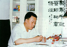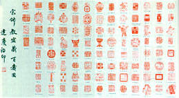 「百壽圖」中采用的是秦漢印、小篆、大篆、繆篆。其中每一句話都帶一個「壽」字,共一百句話。同時這一百句話要用篆字的形式反映到章面上,所以章面要大一些。他就到北京的門頭溝去采集石料,回家后把采集的隨形石料再加工。他說:「當時我刻『百壽圖』每天都不間斷,除了上班,每天還堅持八到九小時以上,因長時間疲勞,刻刀不止一次地劃傷手指。有一次,刻刀一下滑落到左手上,頓時鮮血直流,后到醫院治療縫了五針,第二天,又繼續刻。經常是:餓了,以饅頭加開水充饑;困了,趴在案子上睡一會。」經過一年多的艱苦努力,這套工程浩大的「百壽圖」終于刻制完成了!