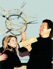 | 張元在法國從著名影星德納芙手中接過[聯(lián)合國和平文化獎]的獎杯。 |