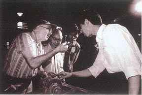 1986年5月,中國聘請的第一位洋廠長--聯(lián)邦德國退休專家威爾納-格里希,在武漢市柴油機廠與工人交談。開放后引進的先進管理經(jīng)驗和人才智力已成為中國的一筆無形財富。
