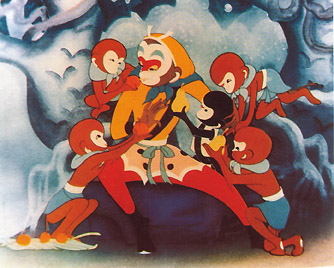 在花果山帶領群猴操練武藝的猴王因無稱心的武器,便去東海龍宮借寶。龍王許諾,如果猴王能拿動龍宮的定海神針--如意金箍棒,就奉送給他。但當猴王拔走寶物之后,龍王又反悔,并去天宮告狀。玉帝采納了太白金星的主張,誘騙猴王上天,封他為弼馬溫,將他軟禁起來。猴王知道受騙后,一怒之下,返回花果山,豎起"齊天大圣"的旗幟,與天宮分庭抗禮。玉帝發怒,命李天王率天兵天將捉拿猴王,結果被猴王打得大敗而歸。玉帝又接受金星的獻策,假意封猴王為"齊天大圣",命他在天宮掌管蟠桃園。一日,猴王得知王母娘娘設蟠桃宴,請了各路神仙,唯獨沒有請他。猴王火冒三丈,大鬧瑤池,打得杯盤狼藉,他獨自開懷痛飲,又吃了太上老君的九轉金丹,收羅了所有酒菜瓜果,回花果山與眾猴擺開了神仙酒會。玉帝暴怒,傾天宮之兵將,捉拿猴王。交戰中猴王中了太上老君的暗算,不幸被擒。老君將他送進煉丹爐,結果不但沒有燒死,反使猴王更加神力無比。于是猴王奮起反擊,把天宮打得落花流水,嚇得玉帝狼狽逃跑。